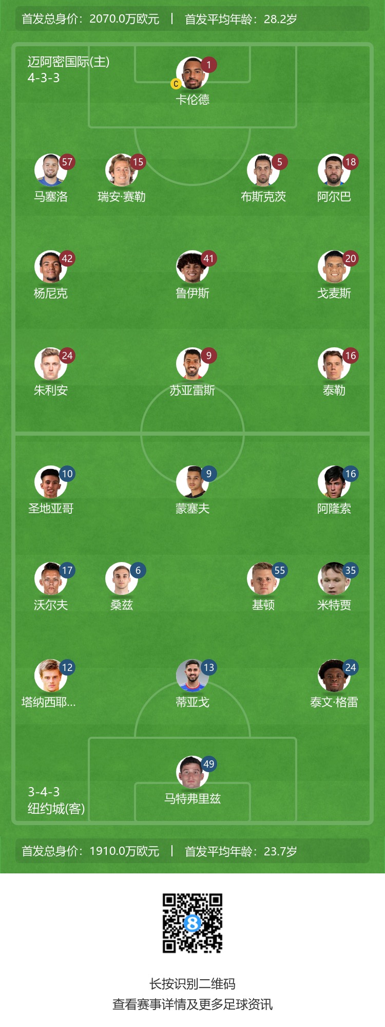 迈阿密国际替补:13-多斯桑托斯、6-阿维莱斯、32-阿伦、33-内格里、43-桑德兰、82-卡萨斯、73-阿方索、8-坎帕纳