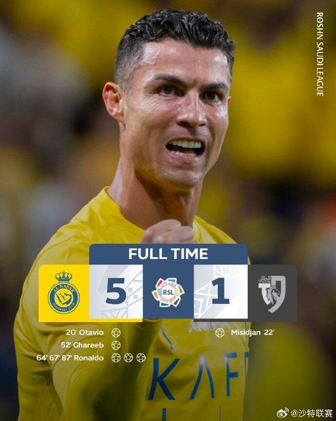 沙特联25轮,C罗戴帽,利雅得胜利5-1塔伊。