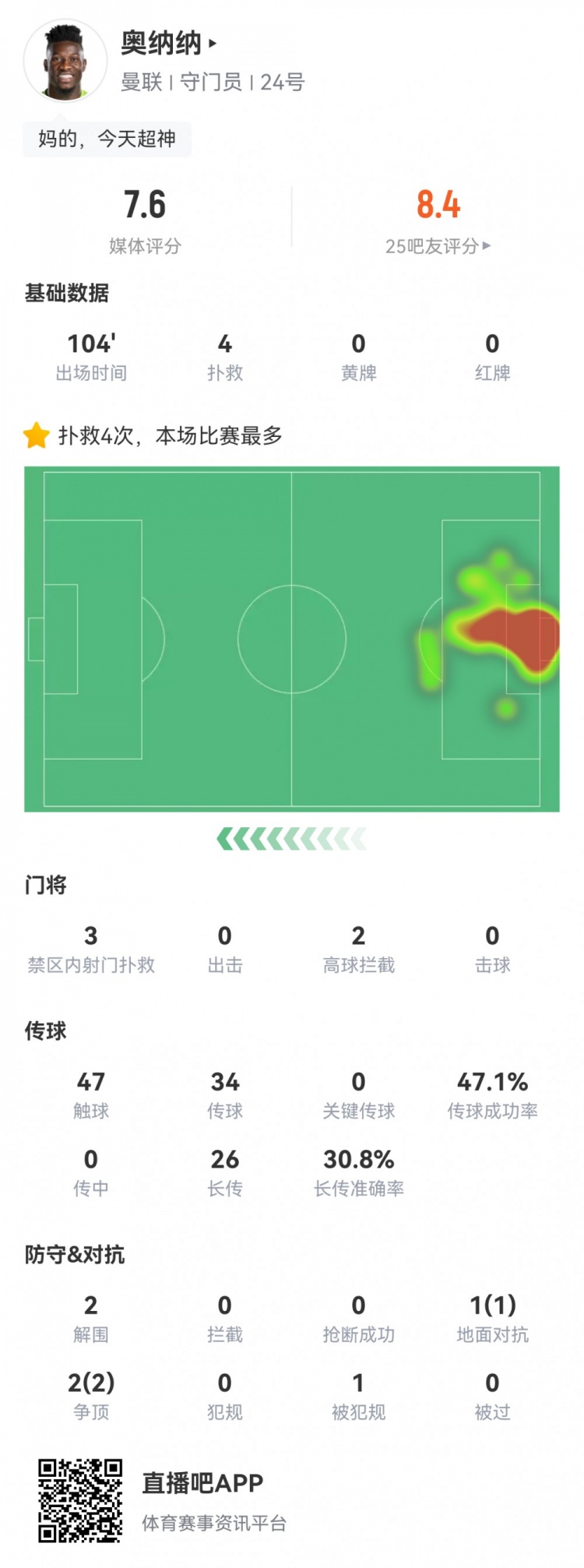 奥纳纳本场打满全场,面对5次射正扑出4个,2次摘高空球,评分7.6分。