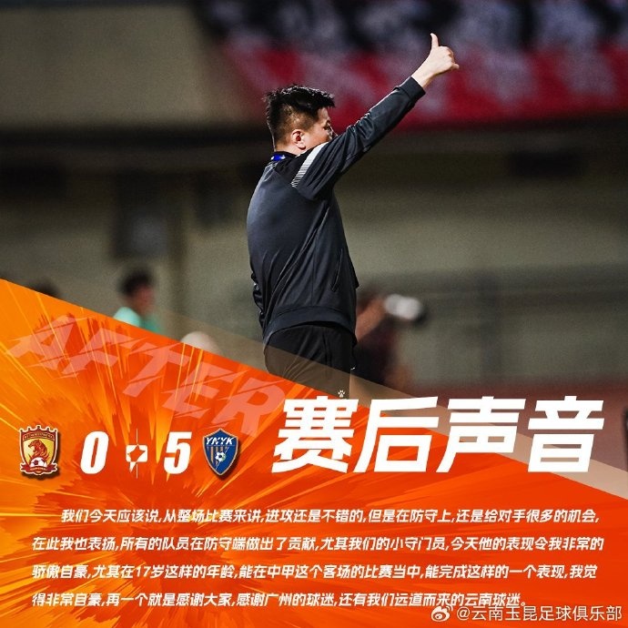 “再一个就是感谢大家,还有感谢广州的球迷,还有我们远征的云南球迷,赛场的气氛真是从始至终的去给主队加油,但同时也激励我们的客队的球员在比赛上顽强拼搏。最后再次感谢我们所有队员这场比赛的付出,因为广州也挺热,消耗力比较大,他们表现真的让我们对这场比赛挺自豪,谢谢。”