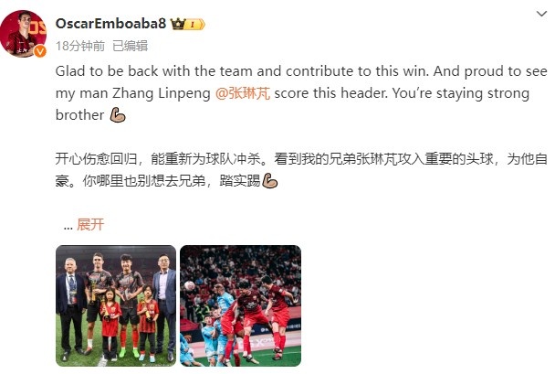 奥斯卡社媒原文:“开心伤愈回归,能重新为球队冲杀。看到我的兄弟张琳芃攻入重要的头球,为他自豪。你哪里也别想去兄弟,踏实踢。”