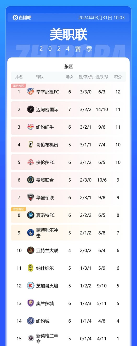 03月31日讯 迈阿密国际1-1战平纽约城,多赛一场暂排东区第二。