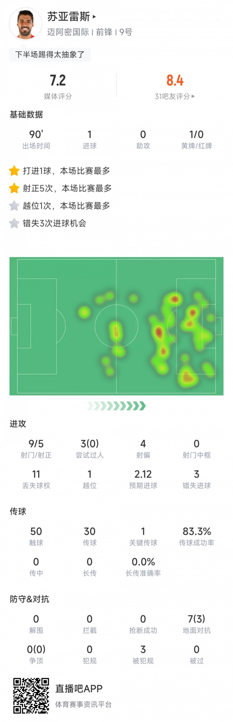 3月31日讯 在北京时间今天上午进行的美职联比赛中,苏亚雷斯破门,帮助迈阿密国际1-1战平纽约城。