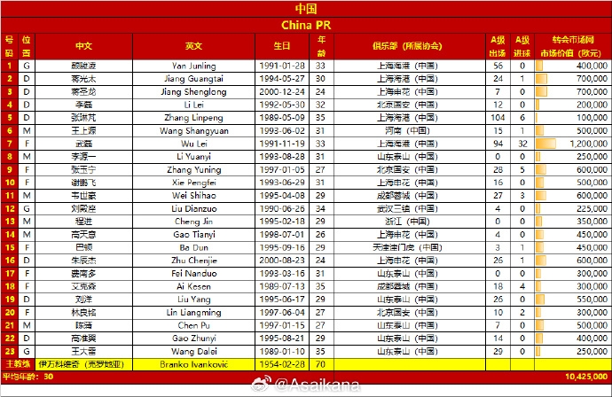 03月21日讯 国足23人比赛名单已经公布,该名单平均年龄为30岁整,高于国足亚洲杯时29.7岁的平均年龄。