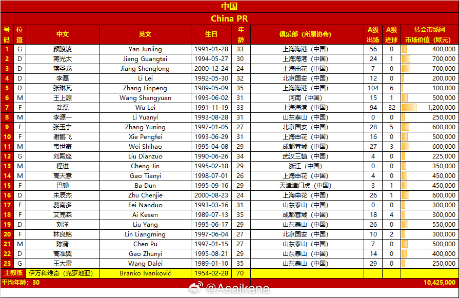 前锋:7-武磊、9-张玉宁、15-巴顿、17-费南多、18-艾克森、20-林良铭