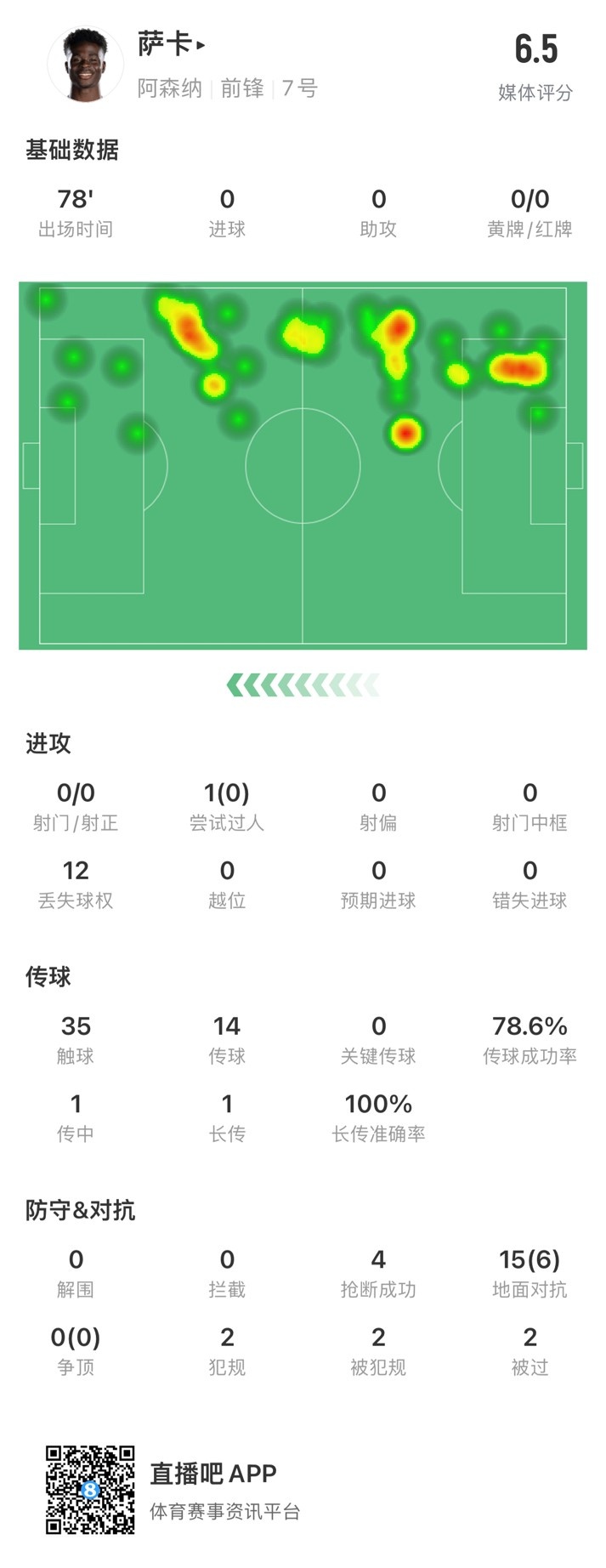 4月1日讯 英超第30轮,曼城对阵阿森纳,阿森纳球员萨卡首发出战78分钟,赛后获评6.5分。