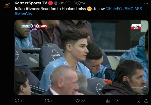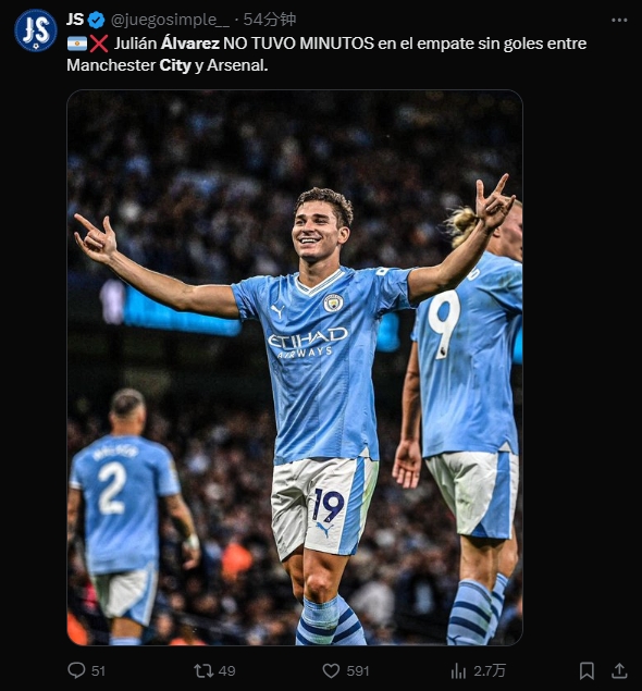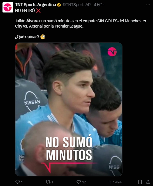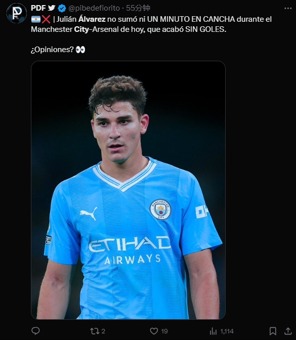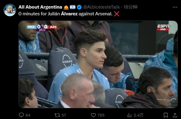 04月01日讯 英超本轮焦点战,曼城主场0-0闷平阿森纳。本场比赛曼城前锋阿尔瓦雷斯替补没有出场。