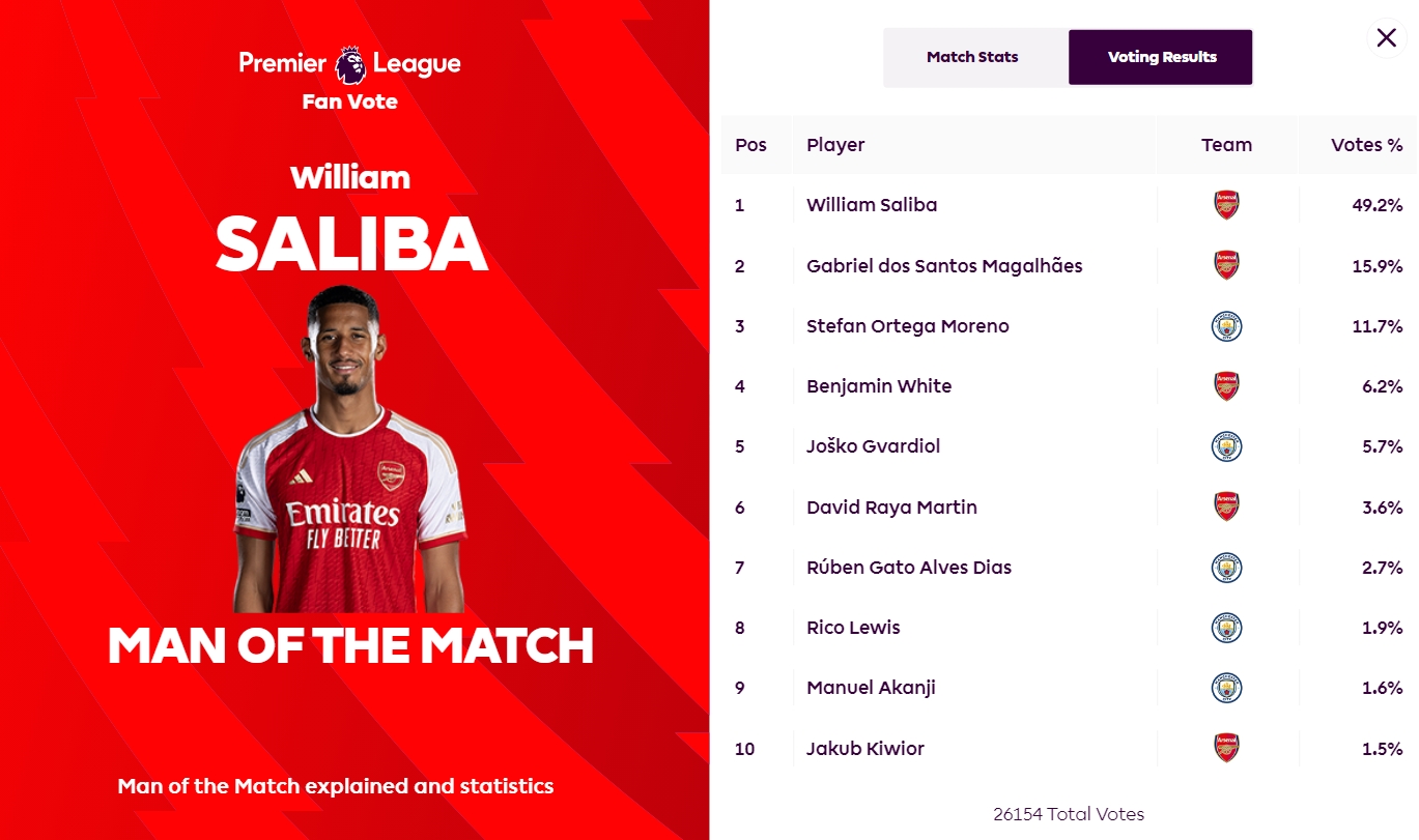 赛后,萨利巴获得了球迷们49.2%的投票,成功当选本场比赛的全场最佳球员。萨利巴的后防搭档加布里埃尔获得15.9%的投票排在第二,奥尔特加排在第三。