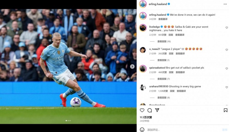 赛后哈兰德也在个人社媒晒出本场比赛个人照片,配文写道:“我们曾经做到过一次,这次依然能够做到。”