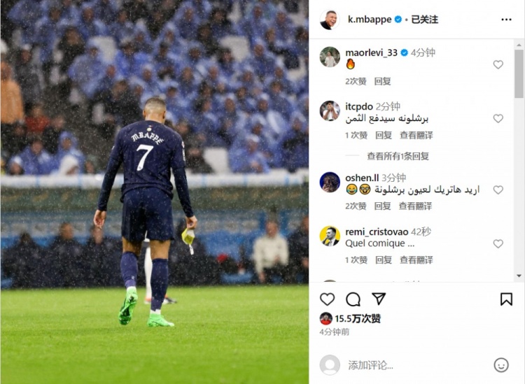 赛后姆巴佩晒出了自己被换下时的低头背影照,且没有任何配文。