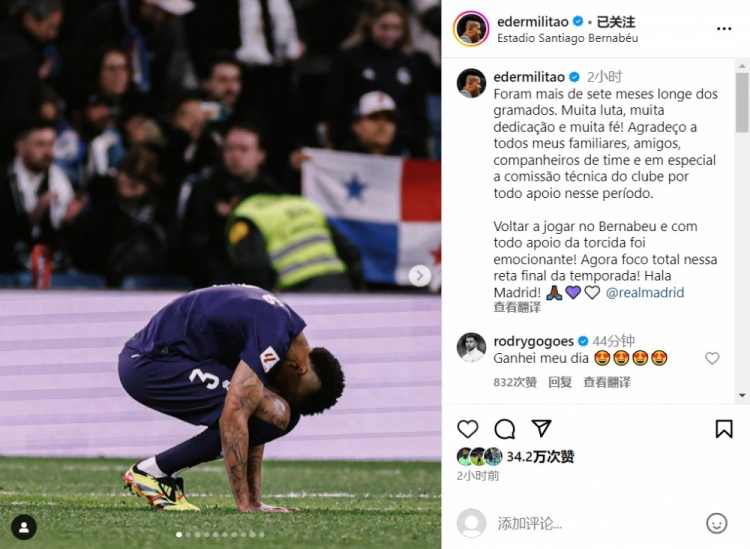 4月1日讯 本轮西甲皇马主场2-0战胜毕尔巴鄂,此役伤缺232天的米利唐最后时刻替补登场迎来复出。赛后球员也是更新社媒致谢团队和球迷。