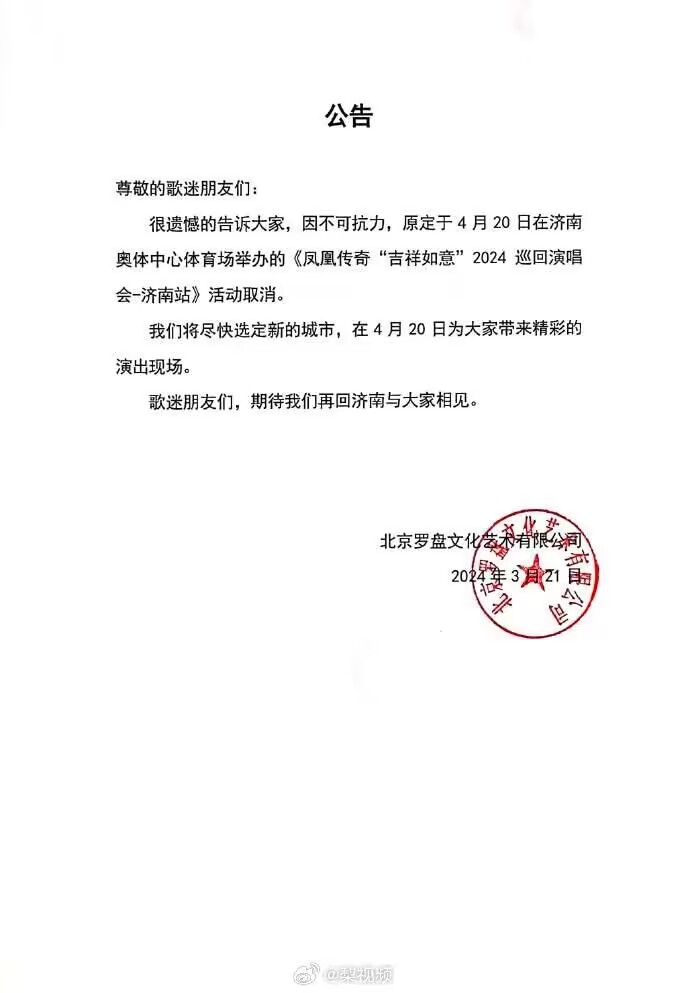 03月21日讯 主办方宣布,凤凰传奇“吉祥如意”2024巡回演唱会济南站因“不可抗力”取消。