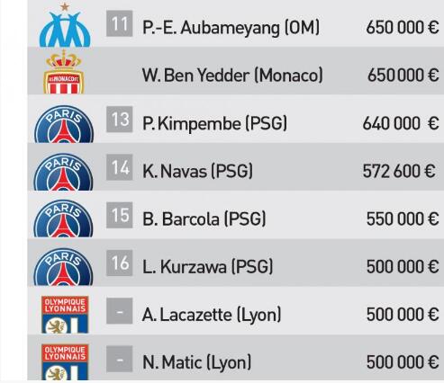 法甲球员月薪top30: