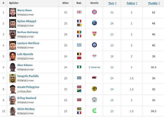 1、凯恩(拜仁):31球,积分62分