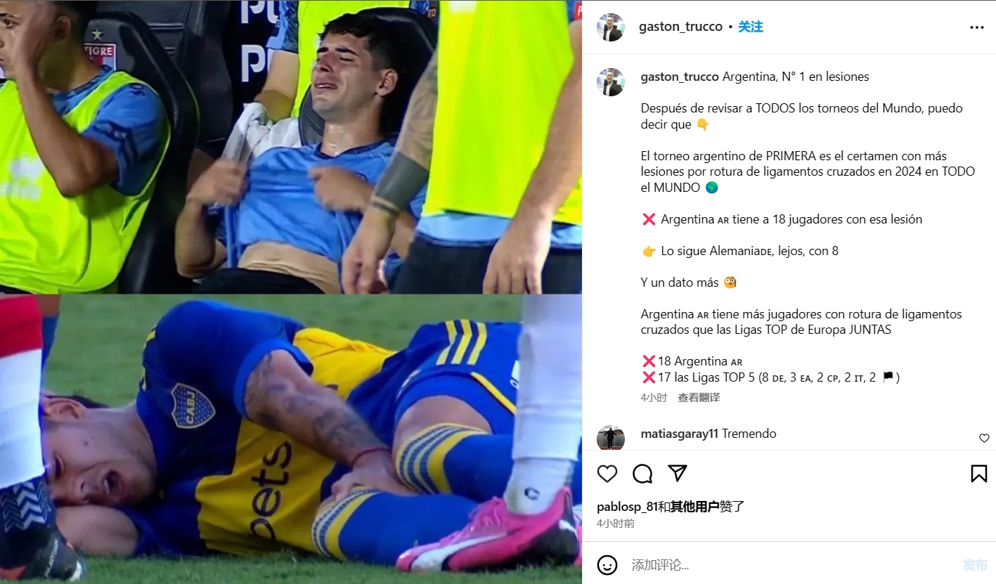 4月2日讯 据记者Gaston Trucco统计,2024年以来阿根廷超级联赛一共有18名球员遭遇十字韧带断裂重伤,高居世界第一,而且这一数字已经超过了欧洲五大联赛总和。