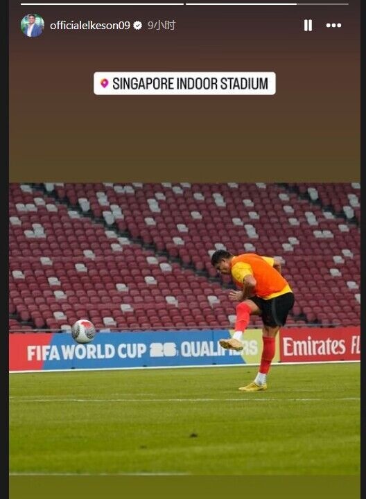 艾克森晒出的赛前踩场训练照,定位为今晚比赛场地新加坡国家体育场。两张照片中,一张是他独自练习射门的照片,另一张是他与张玉宁的对抗。