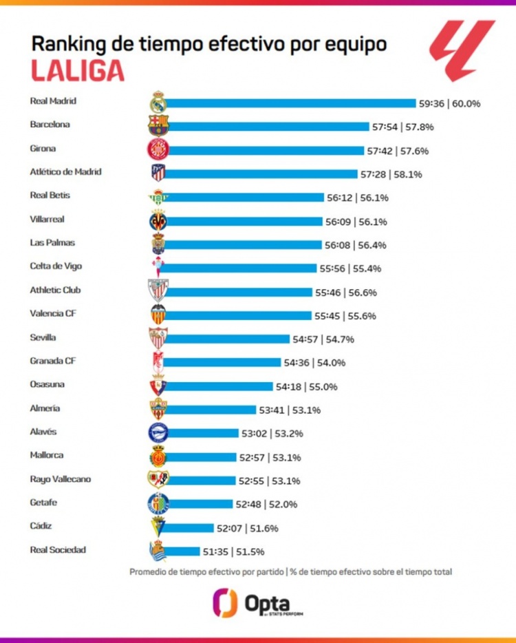 4月2日讯 据OptaJose数据统计,本赛季西甲联赛前四名的球队也是平均有效比赛时长最多的球队,其中皇马平均有效比赛时长59分36秒第一。