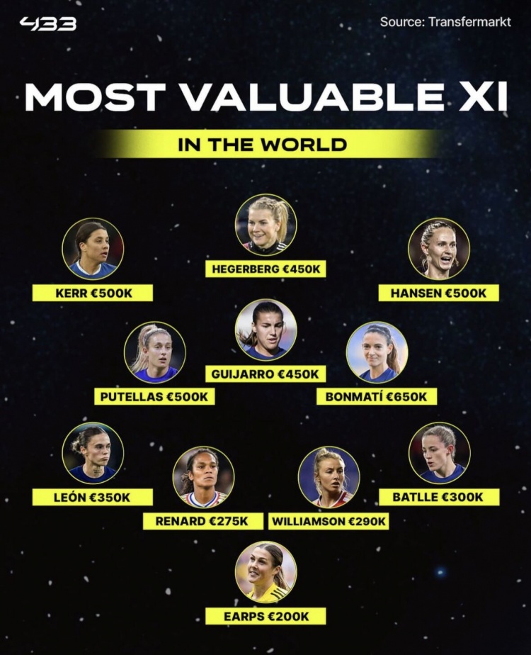 4月2日讯 结合转会市场网的数据,国外媒体罗列出了当前世界女足的最贵阵容,该阵容由世界上身价最高的女足球员邦马蒂领衔。