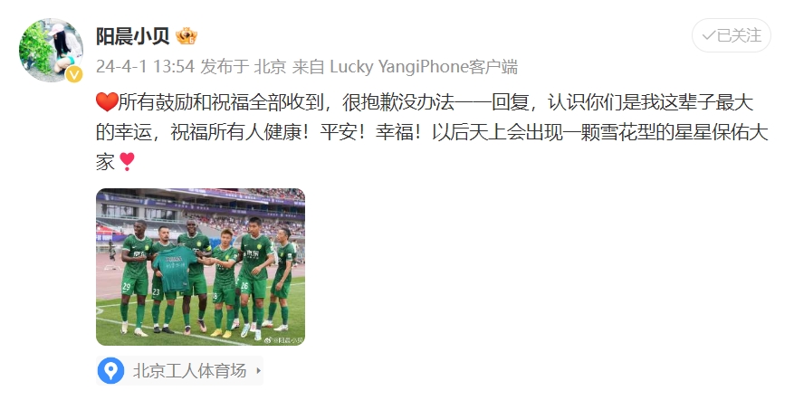上轮比赛国安1-0战胜三镇,全队在进球后举起了一件印有“杨雪加油”的T恤,以表祝福。