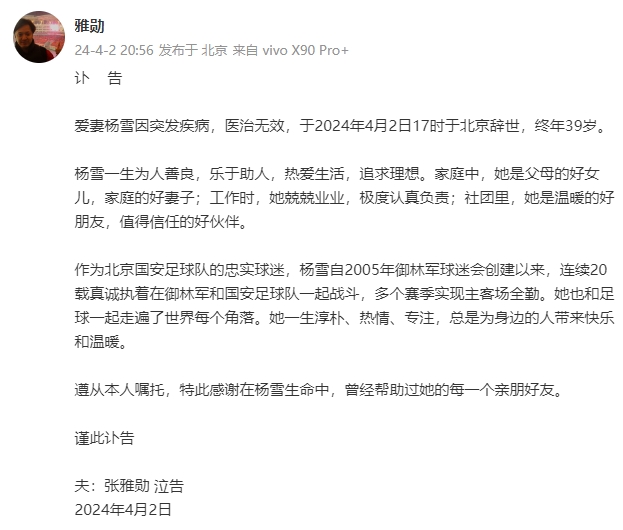 爱妻杨雪因突发疾病,医治无效,于2024年4月2日17时于北京辞世,终年39岁。