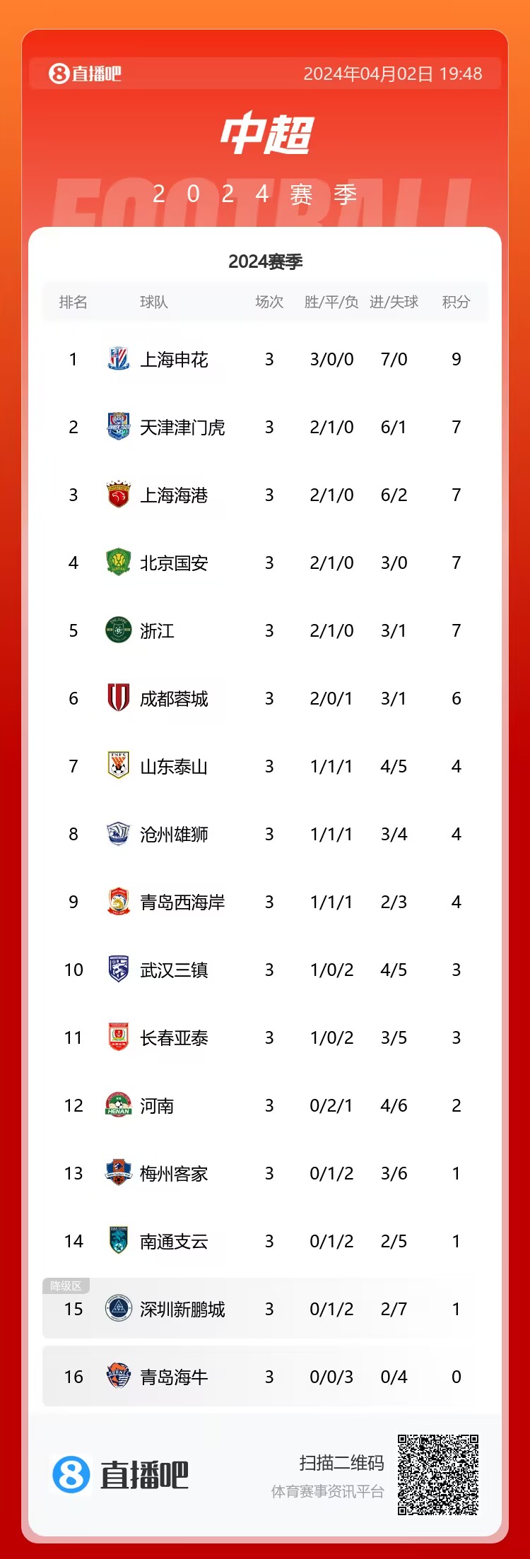 04月02日讯 中超3轮战罢,申花成为唯一的全胜球队,9分领跑积分榜。在申花身后,天津、海港、国安和浙江均2胜1平积7分,蓉城6分,泰山和沧州、青岛西海岸4分。
