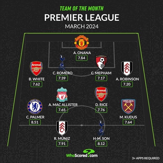 4月2日讯 知名足球数据网站WhoScored评选出了英超三月份的最佳阵容。其中,奥纳纳守门,阿森纳和热刺均有两名球员入选,帕尔默和麦卡利斯特在列。
