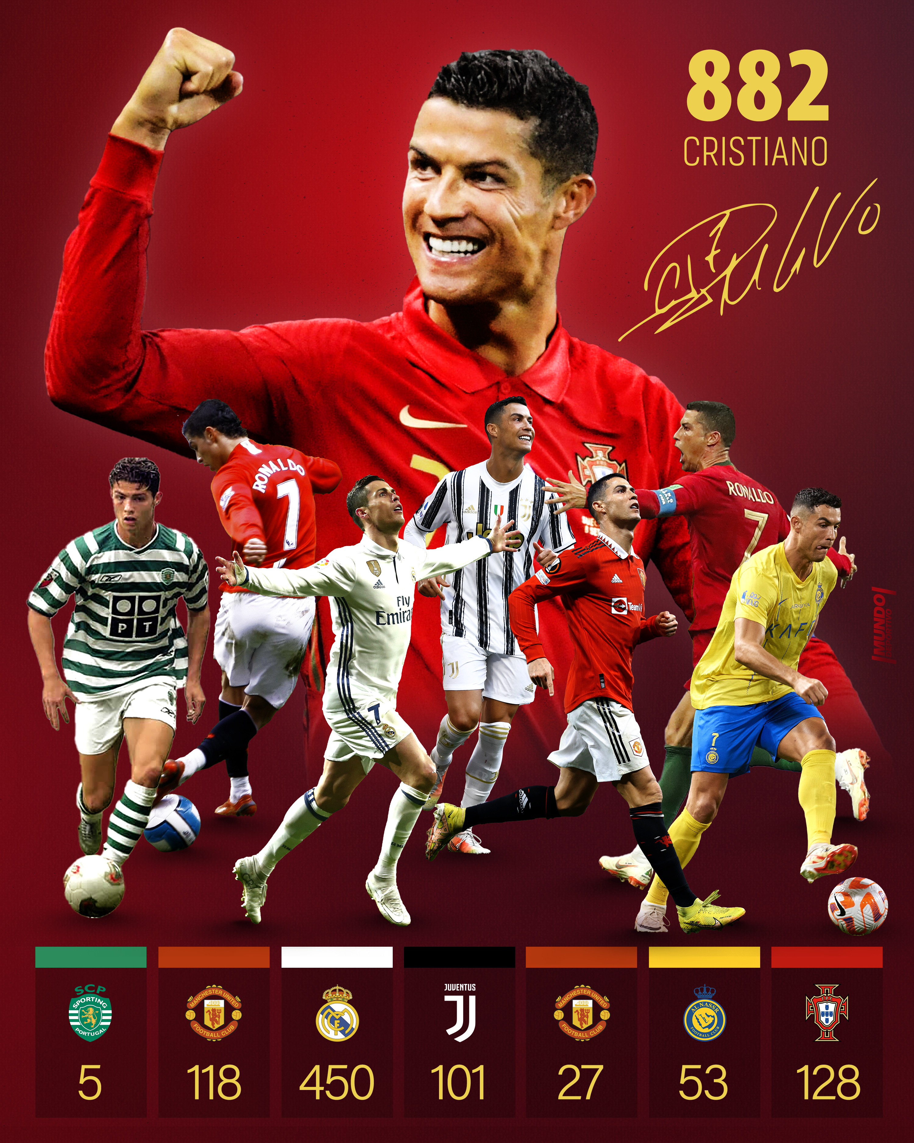 04月03日讯 C罗目前职业生涯已打进882球,其中皇马450球最多。