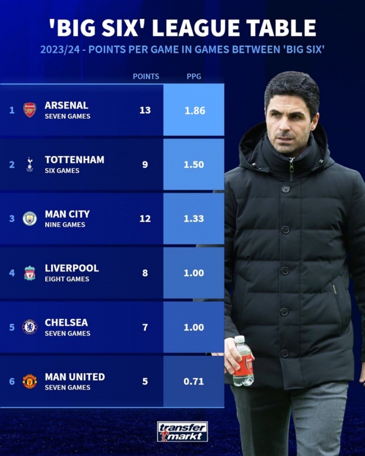 4月3日讯 德转统计23/24赛季英超BIG6内战的积分以及场均积分,阿森纳7场13分、场均1.86分,两项数据都居首,曼联7场5分、场均0.71分,两项数据都垫底。