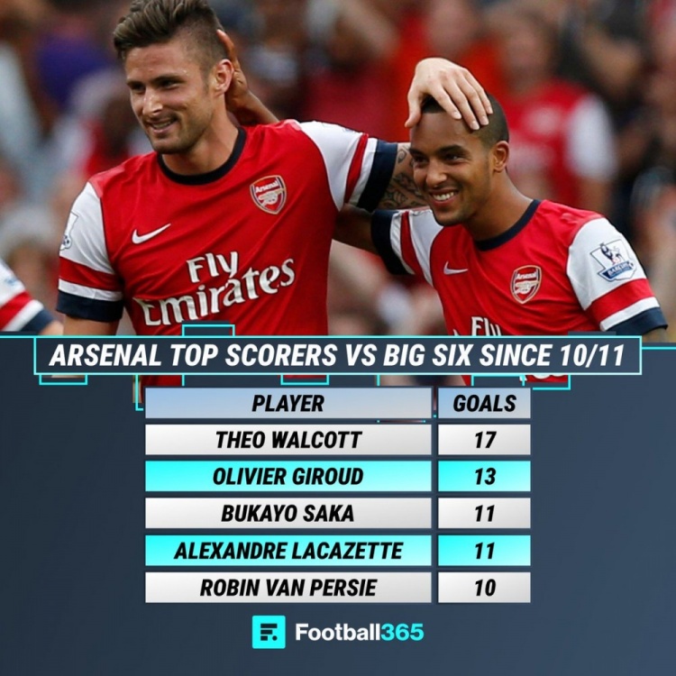 4月3日讯 Football365统计了2010-2011赛季以来阿森纳球员对阵英超BIG6球队的进球数量,并列出榜单,沃尔科特打进17球居首,吉鲁攻入11球次席。