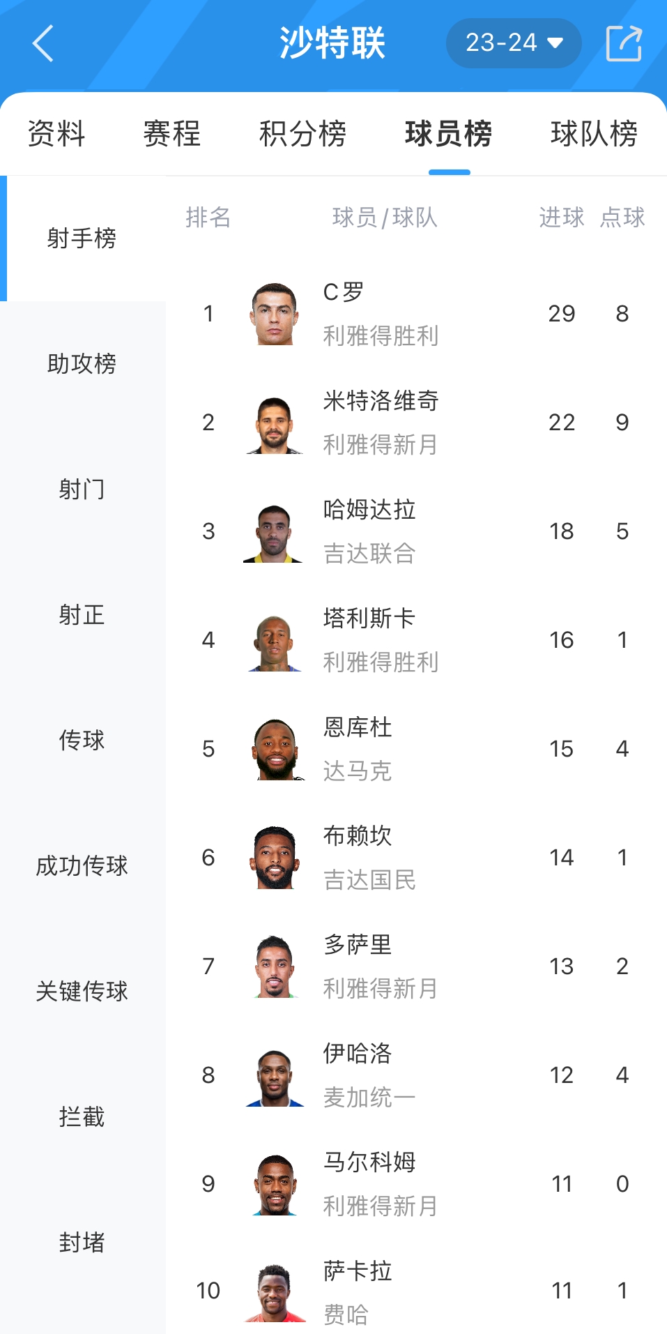 截止目前本赛季沙特联进行了26轮比赛,C罗已经打入了29球,并送出10次助攻,联赛射手榜、助攻榜双榜领跑。