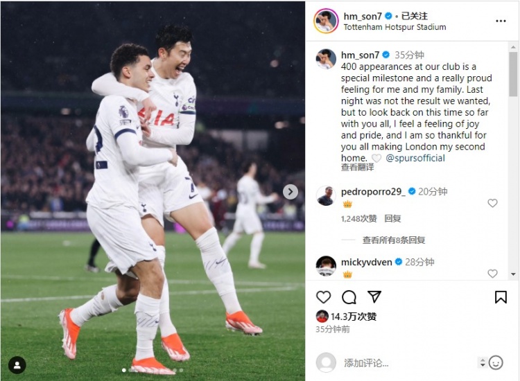 今日孙兴慜更新社媒,发表了自己达成热刺400场里程碑的感受,他写道:“能够为我的俱乐部出战400场比赛,这真是一个具有纪念意义的里程碑,我和我的家人都感到非常光荣。昨晚的比赛结果尽管并不是很如意,但回顾和大家一同度过的这些时光,我的内心充满了愉悦和荣耀,真的我很感谢各位,让伦敦成为了我的第二故乡。”