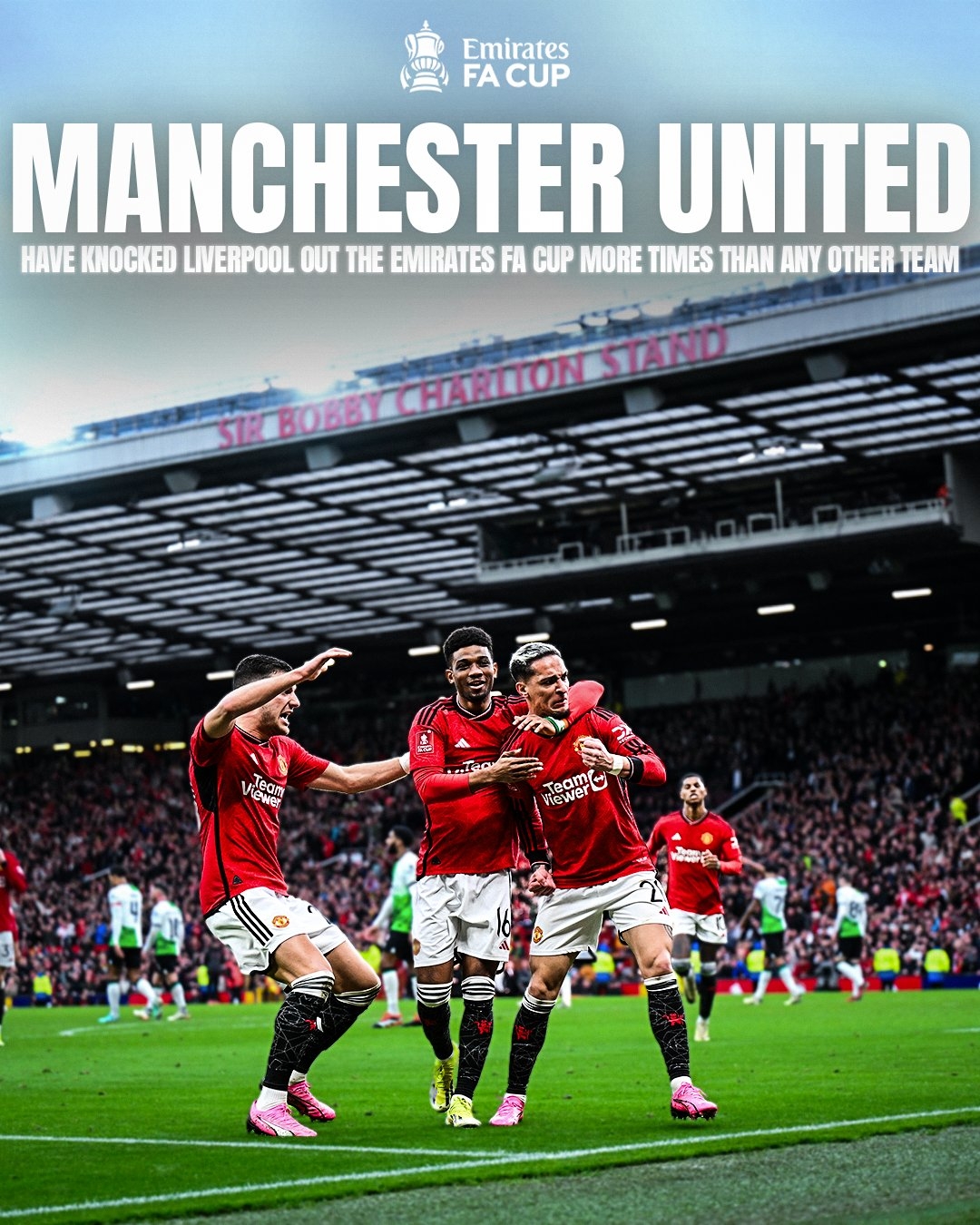 据足总杯官方统计,这已经是曼联在足总杯中第10次将利物浦淘汰出局。红军也成为了红魔在足总杯中淘汰次数最多的对手。