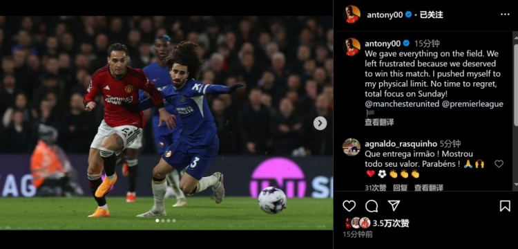 4月5日讯 在今天凌晨结束的英超比赛中,曼联3-4遭切尔西绝杀。本场比赛,安东尼送点,但也收获了本赛季联赛的首个助攻。赛后,他更新了社交媒体动态,为球队鼓舞士气。