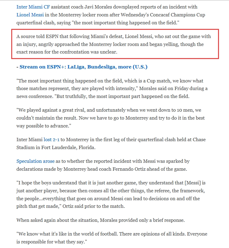 一位消息人士告诉ESPN,迈阿密输球后,因伤缺席比赛的梅西愤怒地走近蒙特雷更衣室并开始喊叫,但冲突的具体原因尚不清楚。(原文:A source told ESPN that following Miami's defeat, Lionel Messi, who sat out the game with an injury, angrily approached the Monterrey locker room and began yelling, though the exact reason for the confrontation was unclear.)