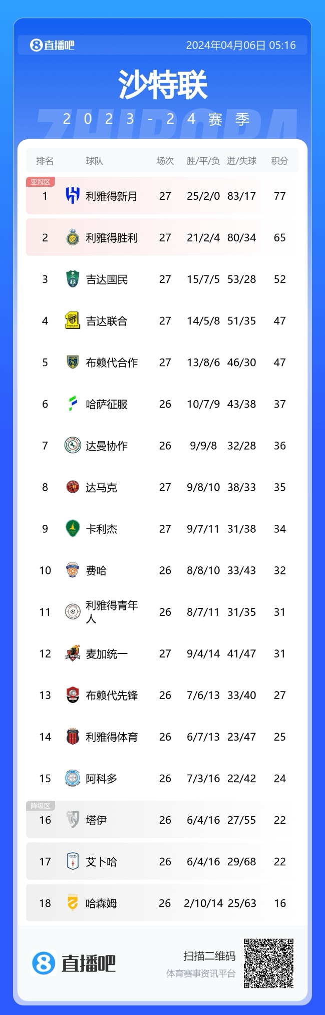 利雅得新月联赛25胜2平,77分领跑。利雅得胜利21胜2平4负,65分第二。