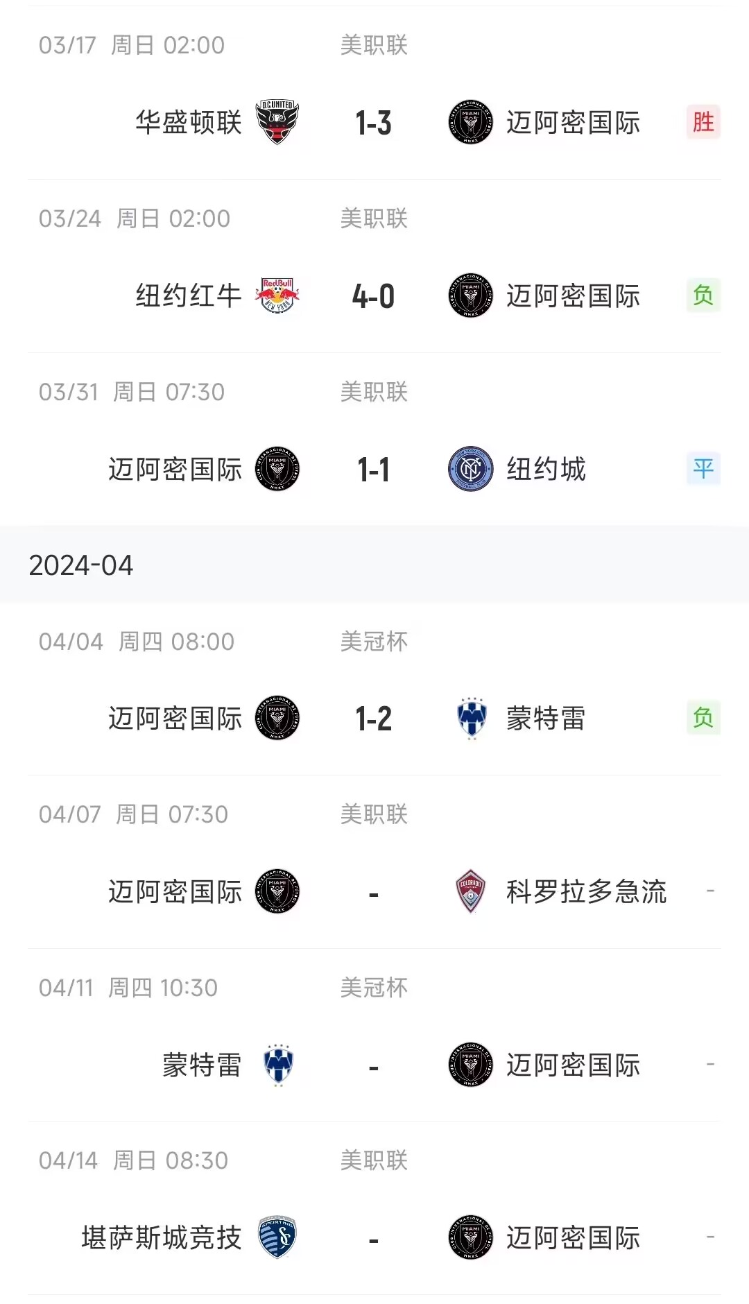 梅西此前缺阵迈阿密国际4场比赛,球队遭遇1胜1平2负。