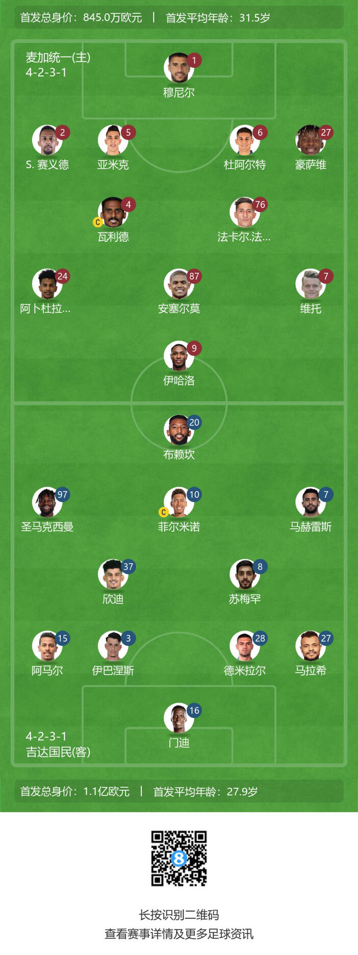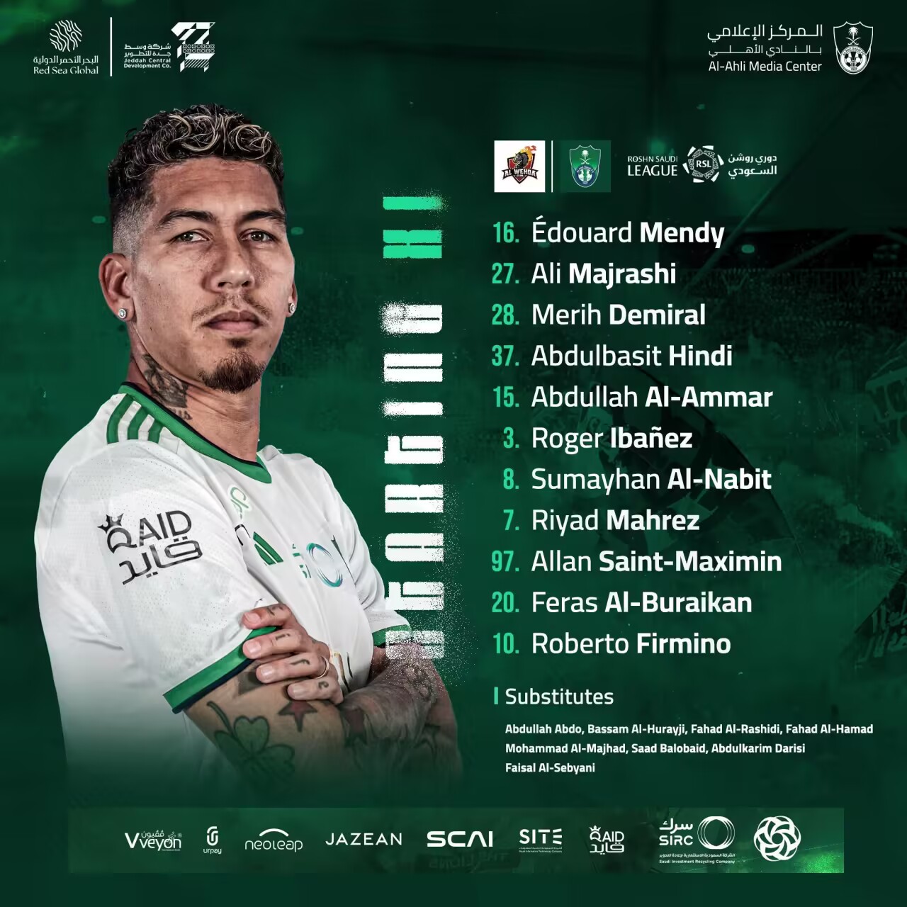 吉达国民首发:16-爱德华-门迪、27-阿里-马拉希、28-德米拉尔、37-辛迪、3-伊巴涅斯、15-阿马尔、8-纳贝特、7-马赫雷斯、97-圣马克西曼、20-布拉伊坎、10-菲尔米诺