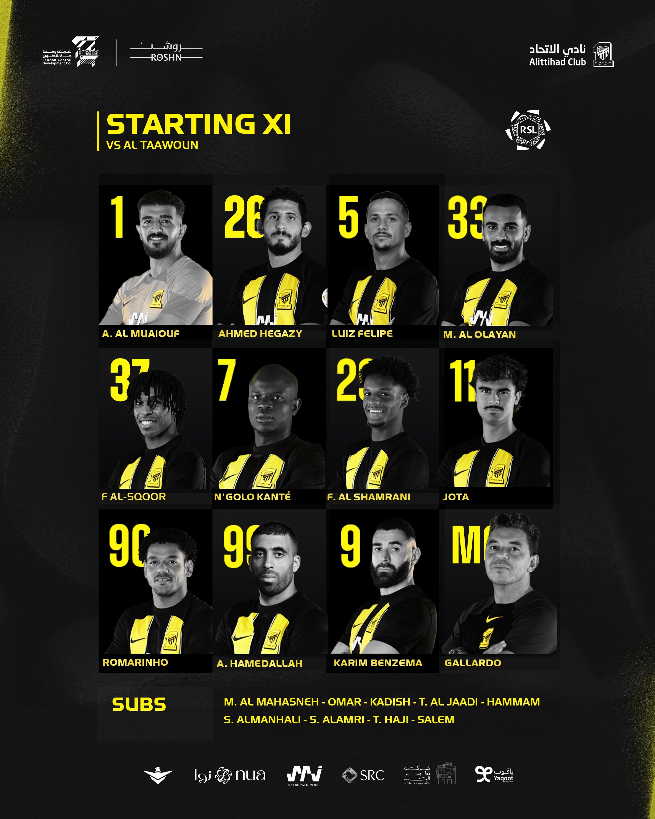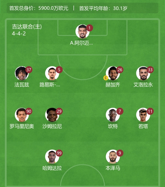吉达联合首发:1-马约夫、5-路易斯-费利佩、26-赫加齐、33-奥拉扬、37-斯库尔、7-坎特、29-法拉赫-沙姆拉尼、9-本泽马、11-若塔、90-罗马里尼奥、99-哈姆达拉