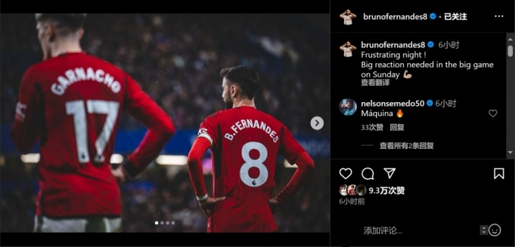 4月6日讯 英超第31轮,曼联客场3-4遭到切尔西读秒绝杀。本场比赛,B费打进一球。赛后,他更新了动态,为球队鼓舞士气。
