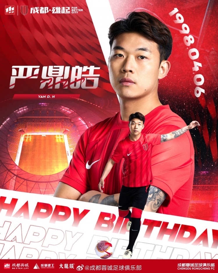 祝严鼎皓生日快乐!1998年出生的你正值当打之年,作为地道的“川娃子”,你不仅继承了这份坚韧与拼搏精神;脚下的每一个动作,更透露出对足球的热爱与执着!