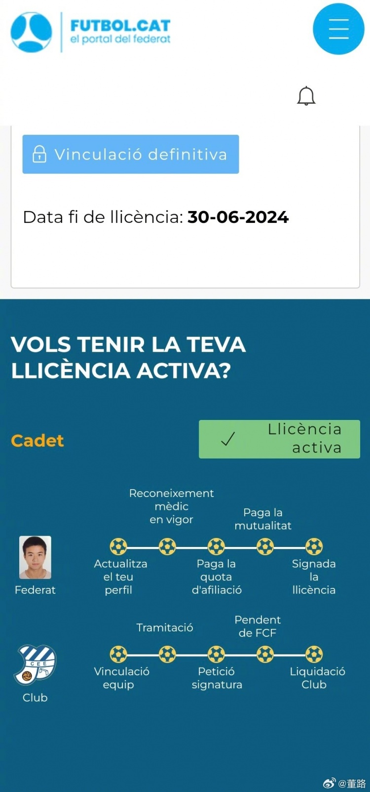 汪修昊本次加盟球队是欧罗巴,这是一支来自加泰罗尼亚大区0809年龄段二级联赛的队伍。该队目前排名第二,保留冲击下赛季一级联赛的机会。