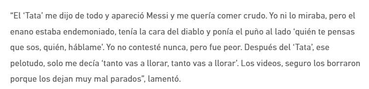 “马蒂诺告诉了我这些情况,梅西之后出现,想生吃了我。我甚至不敢看他,但那个矮人着魔了一样,有着一张魔鬼的脸,他把拳头举在身侧:‘你以为你是谁,谁?告诉我’。我没有回答,但情况变糟糕了。之后马蒂诺,那个白痴,他就告诉我:你绝对会哭出来,痛哭。”