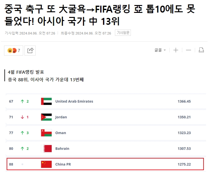 韩媒《마이데일리》(mydaily)报道了国足的排名,并表示这是中国足球的一大耻辱,连FIFA亚洲前十都进不了。
