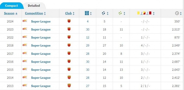 2018赛季,武磊总计在联赛出场2549分钟,平均每94.4分钟打入一球;本赛季截至目前武磊共出场350分钟,每70分钟打入一球的效率,至少目前暂时高于巅峰期的2018赛季。