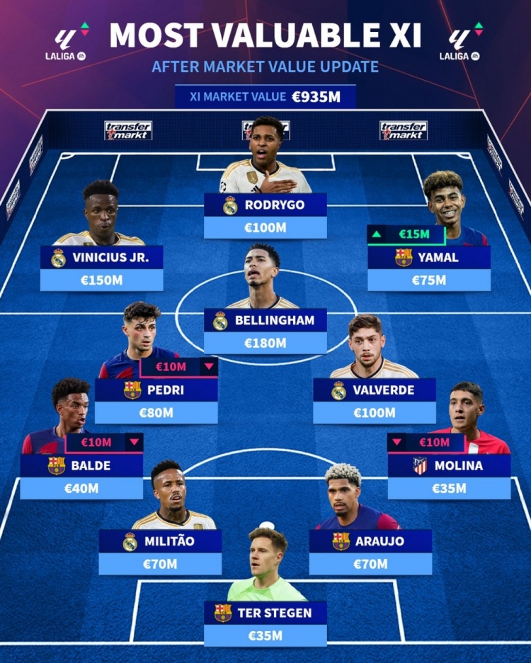 西甲德转身价最高阵容(总价9.35亿欧):