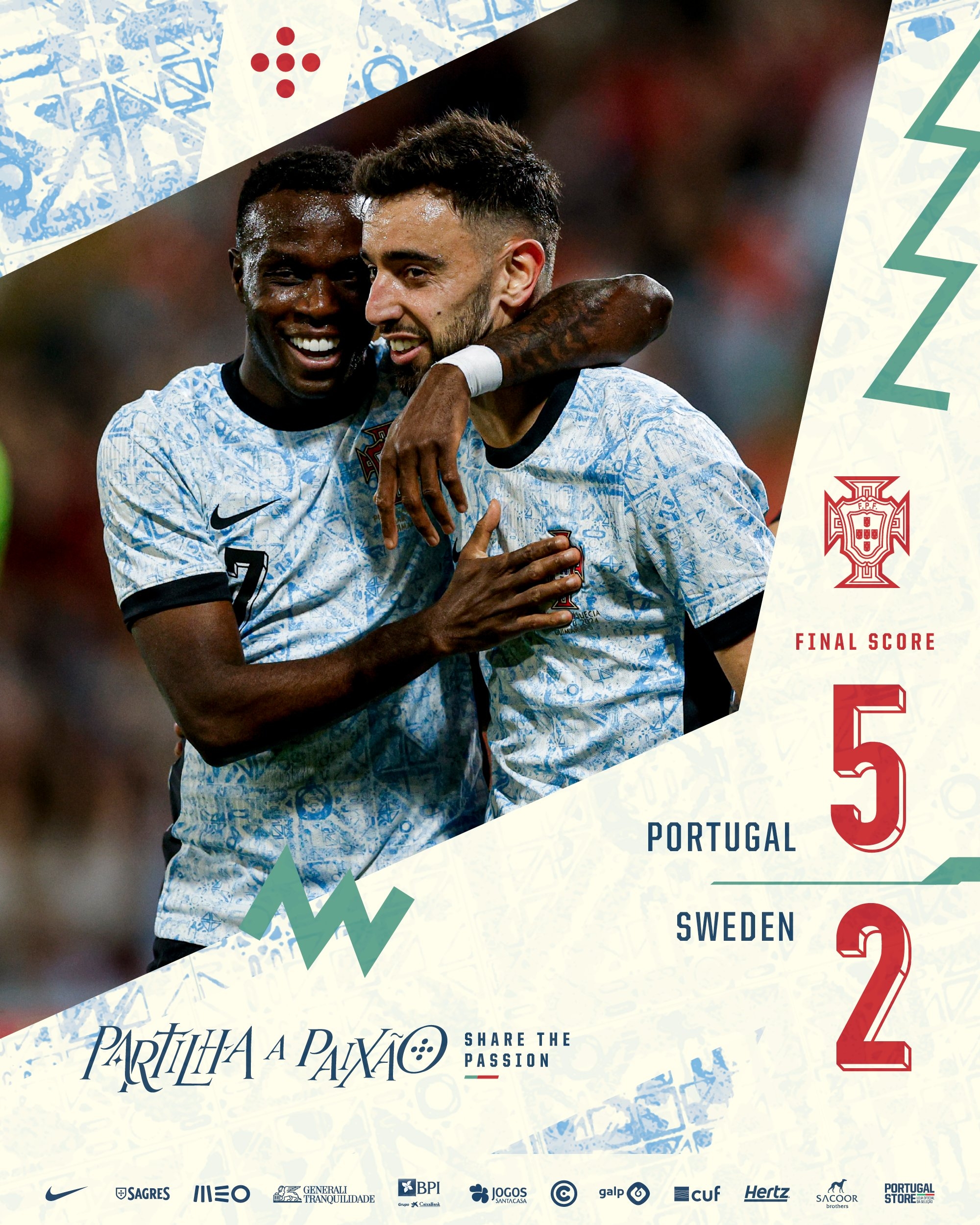 葡萄牙在友谊赛5-2击败瑞典,本场C罗缺阵,B费传射,葡萄牙各赛事取得11连胜。