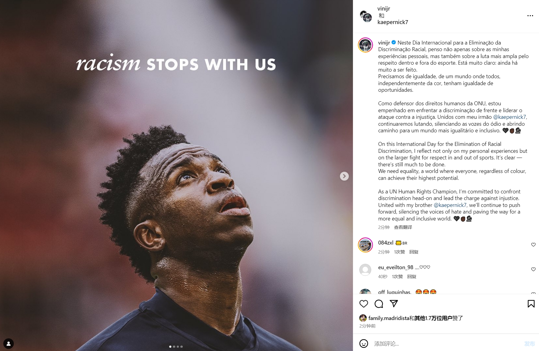 维尼修斯写道:“值此消除种族歧视国际日之际,我不仅反思了自己的个人经历,而且回顾了体育运动内外为争取尊重而进行的更广泛的斗争。很明显,还有很多工作要做。
